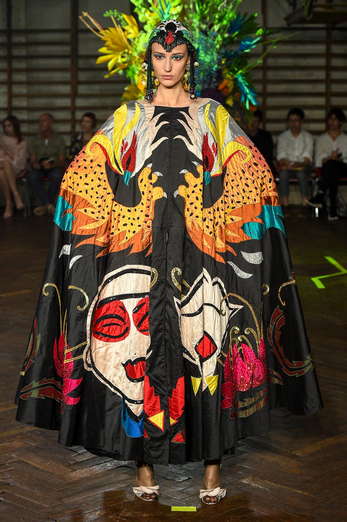 The results on the catwalk are, inevitably, overflowing with equally offbeat ideas, witty details and a sense of humour that happily cohabits with exquisite craftsmanship and an unfettered elegance. Glynis Jones describes them as ‘wearable art pieces that are the ultimate expression of the designers’ fantastical narratives, creative collaborations, art prints and artisanal embellishments’.