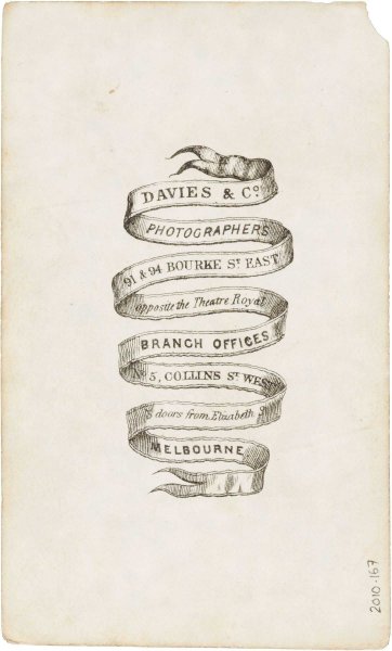 English photographer William Davies had arrived in Melbourne by 1855. He is said to have worked with his friend Walter Woodbury and for the local outpost of the New York firm Meade Brothers before establishing his own business in 1858. By the middle of 1862, ‘Davies & Co’ had rooms at 91 and 94 Bourke Street, from where patrons could procure ‘CARTE de VISITE and ALBUM PORTRAITS, in superior style’. Like several of his contemporaries and competitors, Davies appears to have made the most of his location ‘opposite the Theatre Royal’, subjects of Davies & Co cartes de visite including leading actors such as Barry Sullivan and Gustavus Vaughan Brooke, and comedian Harry Rickards. Examples of the firm’s work – portraits and views – were included in the 1861 Victorian Exhibition and the London International Exhibition of 1862; and at the 1866 Intercolonial Exhibition the firm exhibited ‘Portraits, Plain and Coloured, in Oils and Water Colours’ alongside a selection of views for which they received an honourable mention.