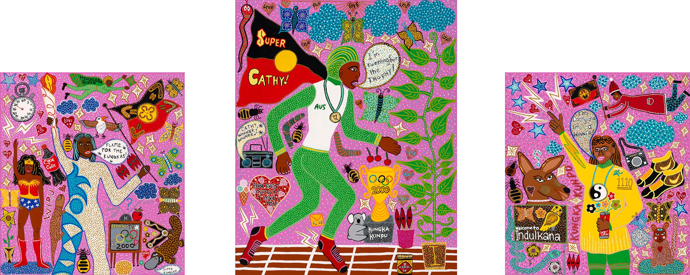 Kaylene Whiskey is a Yankunytjatjara woman of the Anangu Pitjantjatjara Yankunytjatjara (APY) Lands, who grew up in Indulkana in north-west South Australia. Grounded in the power of storytelling and celebration, Whiskey’s vibrant and joyful portraits combine Anangu culture with global pop culture and surround her subjects with text and symbols that carry important messages about care and love. Divided into three distinct canvases, Whiskey’s portrait of Freeman captures the artist’s memories of this historic moment and its lasting impact. ‘I was in Indulkana with my family, we were all watching her race on the television. Everyone was yelling loudly “run Cathy! Go Cathy!” and when she crossed the finish line we were all jumping up and cheering so much … Cathy is a hero for Aboriginal people, she is a kungka kunpu – a strong woman.’