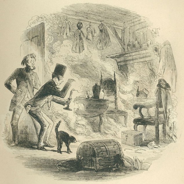 For the time being, however, Chesney Wold springs to life (Ch. 12): “Seen by night, from distant openings in the trees, the row of windows in the long drawing-room, where my Lady’s portrait hangs over the great chimney-piece, is like a row of jewels set in a black frame.” As well, the pictures seem to ape Sir Leicester’s almost wilful obliviousness; elsewhere (Ch. 40) he is brilliantly described as “a magnificent refrigerator.” Pausing at the foot of the oak staircase with absurd ceremony, Sir Leicester prepares to act as My Lady’s “knightly escort,” whereupon “A staring old Dedlock in a panel [Eworth or Gheeraerts or Peake or some such], as large as life and as dull, looks as if he didn’t know what to make of it—which was probably his state of mind in the days of Queen Elizabeth.”