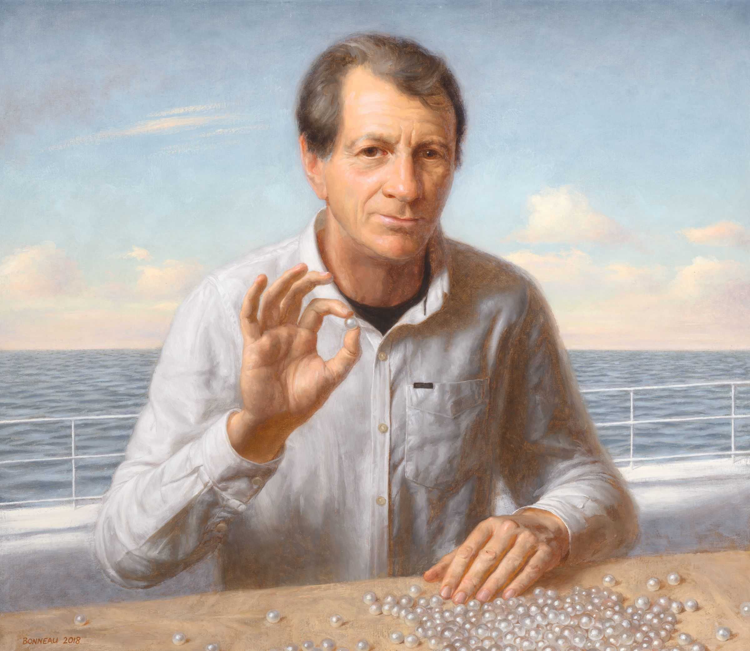 ‘While making this portrait, I had the privilege of spending many hours with Mr Paspaley, painting and talking with him. Mr Paspaley’s many achievements, including revolutionising the pearling industry and building a hugely successful business, all seem to originate from the many years he has spent at sea, pursuing and refining the method of finding the perfect pearl. I have represented him in the ocean on one of his pearling boats at the end of a day’s harvest, presenting a pearl he has selected to the viewer.’
