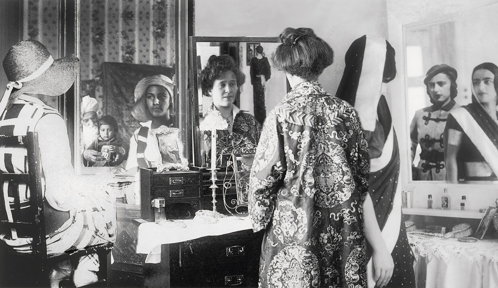 This drive to resurrect history and question fact and fiction, mortality and immortality, memory and reconstruction underlies Re-take of Amrita as does the importance of the photographic medium. The latter may undercut any of the upper-class and bohemian advantages the family represents through the face; as Christopher Pinney points out, the focus on the face was the privilege of the modern Indian state as photography enabled ‘every citizen’ a face, which before had been the right of only gods and kings.3 As such the status of the Sher-Gil family is marked not only by the impossible luxury of decor and dress (or the equally impossible photographs of nudity), but also ordinariness. Sundaram also nods to the radical experiments of the Surrealists, who were prominent during the time of Amrita’s stay in Paris (and whom she ignored), but shows signs of fulfilment in the use of unconscious desire to reshape everyday life which Sundaram achieves through manipulation of a conventional and intimate family album in the form of photomontage. The process of representation itself is at stake, from the history of photography and his grandfather’s pioneering use of autochromes and experiments with the stereoscopic camera under colonialism to Sundaram’s use of computers and Photoshop in a democratic and post-liberalized India ready to reflect on its past and recreate family legacy through new technology, or a fictional version of truth staged and sold at the millennium.