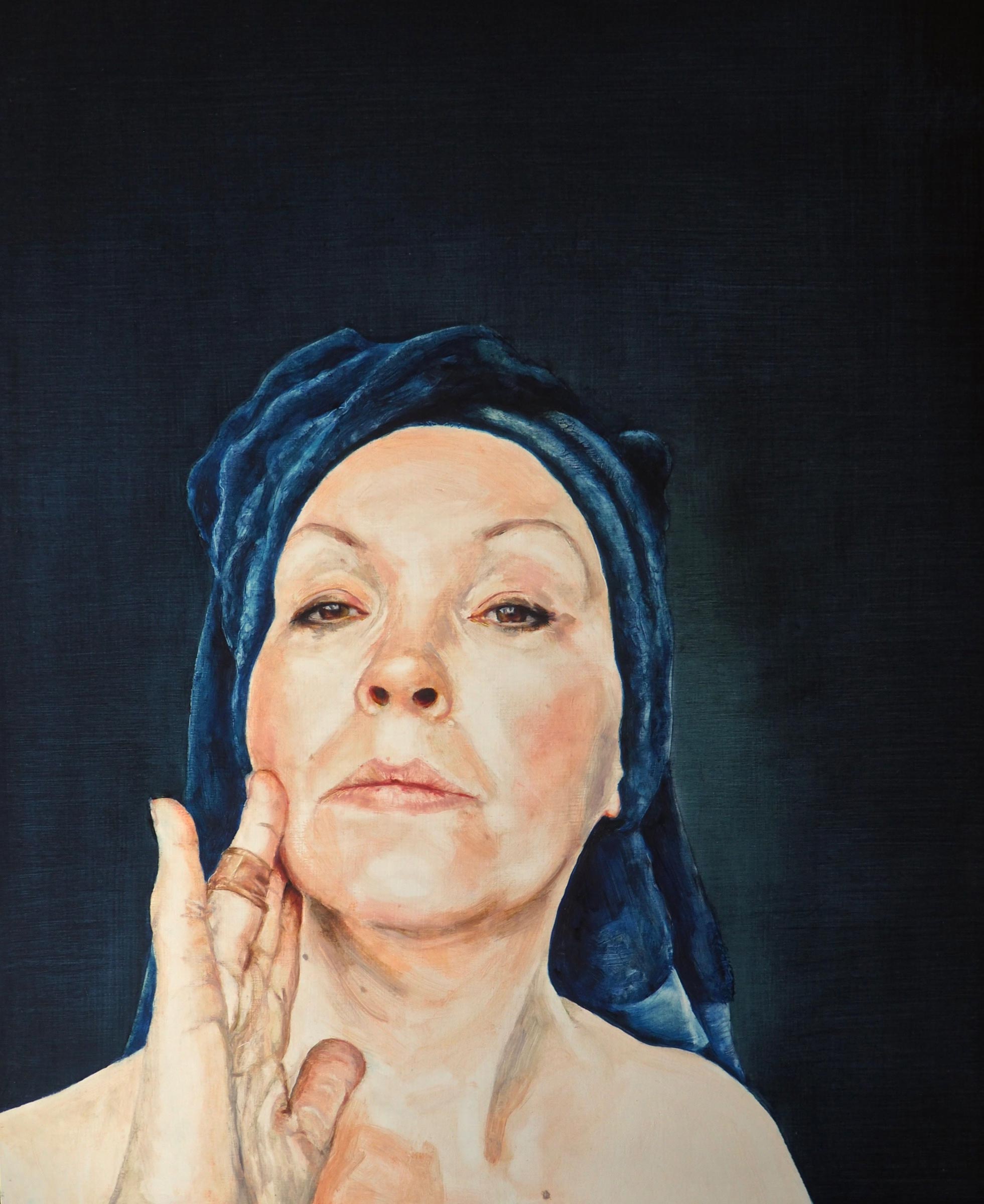 These days I do not spend that much time looking at myself, except for seeing my reflection in the mirror during my morning routine. Sometimes I am shocked when the inside feeling doesn't quite match the ageing outside appearance. A towel wrapped tightly around my head to hold back my wet hair is a kind of instant facelift, as it makes the skin on my face taut and lets me see a woman that hasn't changed quite so much. Painting this self-portrait was an act of closer inspection, self-contemplation and acceptance.