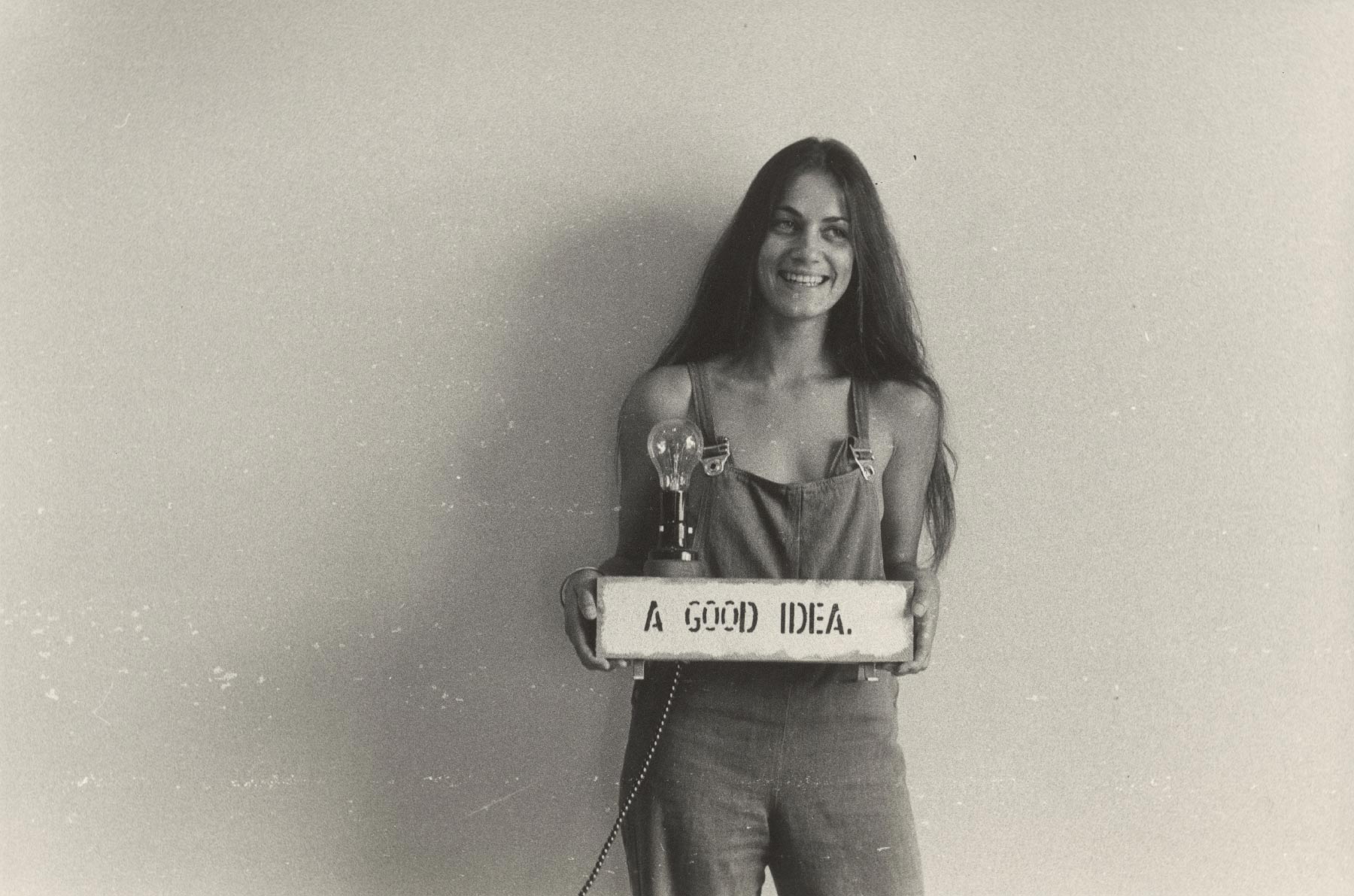 Linda Piper, an actor who appeared in Jerrems’ short film Hanging about (1978), holds a conceptual sculpture by Aleks Danko; a light globe mounted on a block stencilled with the words ‘A GOOD IDEA’. In this portrait, used on the cover of A book about Australian women, Piper engages easily with the photographer, relaxed in her stance, smiling and glancing beguilingly out of frame. The photograph on the back cover presents an abrupt contrast. Piper is still holding the sculpture but this time the globe is illuminated, casting her features in light from below. She does not smile, instead, her shadow looms behind her as she fixes a severe gaze towards the camera. This ominous ending to the book hints at the fact that, while the light might be on, women in Australia were not set for an uncomplicated future.