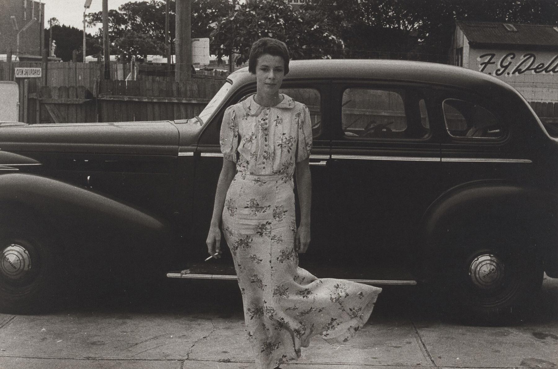 In the work simply titled Lynn, Gailey stands in the office in raking light, with shadows from a window frame cutting across her body, emphasising the gentle lean of her hip under her vintage dress. Her gaze is resigned and resistant at once, as though she is waiting for the photo shoot to be over. Jerrems was persistent and would usually continue a shoot until she got the frame that she wanted – often just after the sitter was ready to give up.
