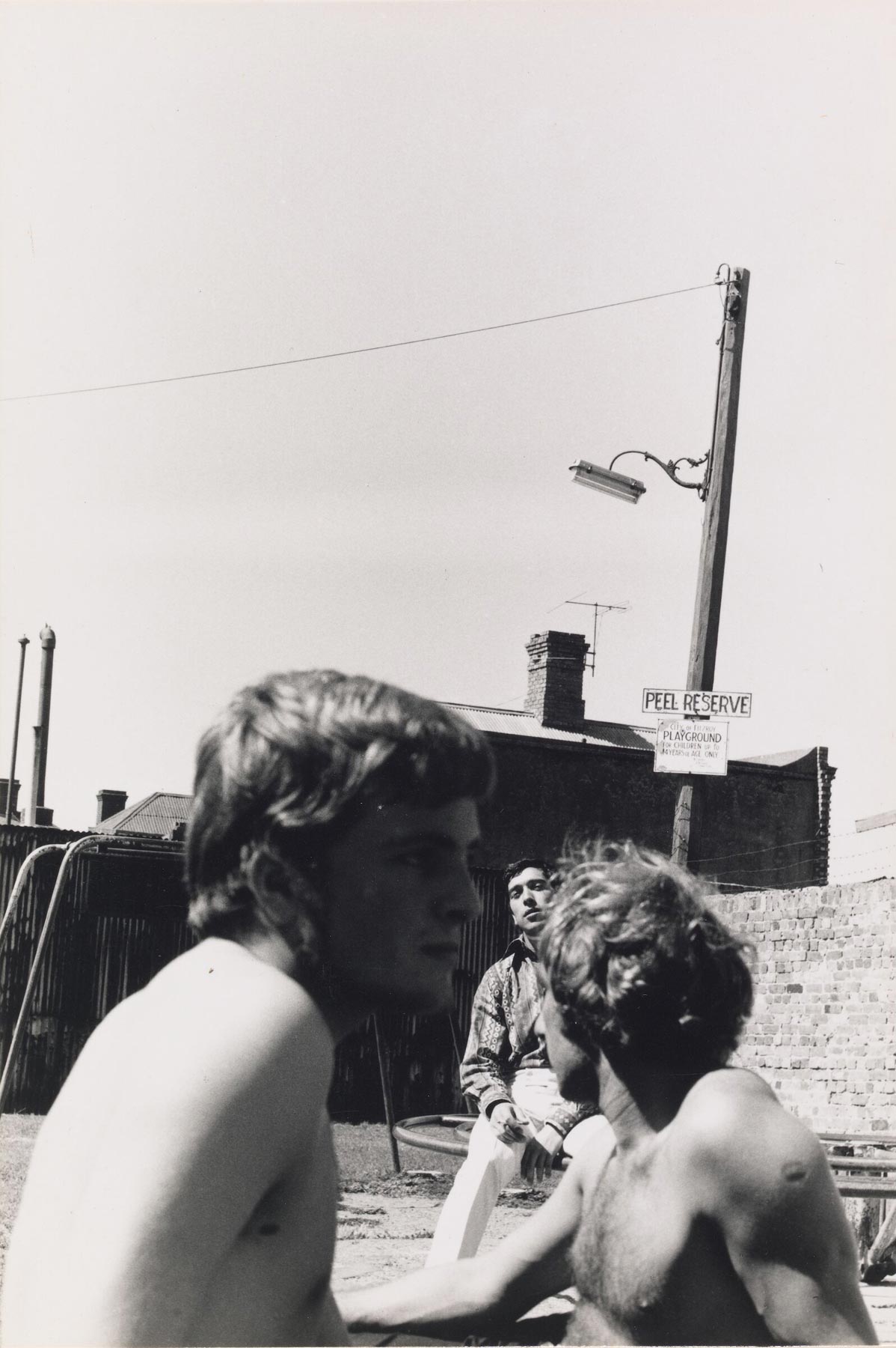 Peel Reserve is an early example of Jerrems’ experimental approach to image composition, with a triangulation of bodies and gazes structuring the scene. Two bare-chested youths bow their torsos towards each other but look beyond the frame, while only the smaller, seated figure in the background connects directly with the photographer.