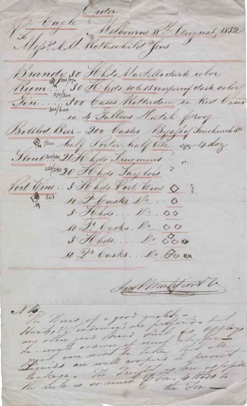 List of beer, wines and spirits shipped by N M Rothschild & Sons to Montefiore. ‘NB – The wines of a good quality – Hunts and Sandemans are preferred.’