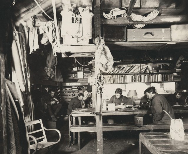 Interior of Commonwealth Bay living hut (L-R) Mertz, McLean, Madigan, Hunter and Hodgeman, 1912