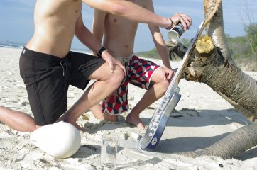 This twenty-something contemporary artist/surfer dude has rock star ambitions. Dammn’s most recent outing was as part of Redford’s major exhibition at the Queensland Art Gallery Scott Redford: Introducing Reinhardt Dammn where Redford’s celebrated surfboard sculptures shared space with Dammn’s vivid blue and white expressionist ‘instant paintings’ of sea and surf. Dammn’s artworks were designed by Redford to be props in a feature film about the energetic life of Reinhardt Dammn but they have already gained a currency in the ‘real’ art world. The Reinhardt Dammn cosmos incorporates myriad artworks with a pop–punk edge, screen tests and photo-shoots, all with the elaboration of Reinhardt Dammn in mind. Recently Redford produced and directed a series of photograph sessions and was happy to explain the process.