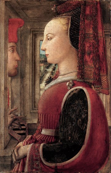 Chins were also ‘worn very high’ in fifteenth-century Italy, as anyone who examines the profile portraits of the young women in this exhibition - many of them painted to commemorate their engagements or marriages - will discover. We may laugh at the superficiality of Lady Bracknell’s criteria, but her assessment would have struck a sympathetic chord not only among the wealthy families in fifteenth-century Florence, where social connections, money, and appearance were primary considerations in any marriage, but also among the rulers of the smaller courts of central Italy, who were always attentive to potential dynastic alliances. We have a memorable record of this in the letters of Alessandra Strozzi, who was on the lookout for a Florentine wife for her son Filippo, then still living in political exile in Naples. In the summer of 1465, Alessandra attended mass in the cathedral with the explicit purpose of getting a good look at a prospective daughter-in-law. ‘She seemed to me to have a beautiful figure and to be well