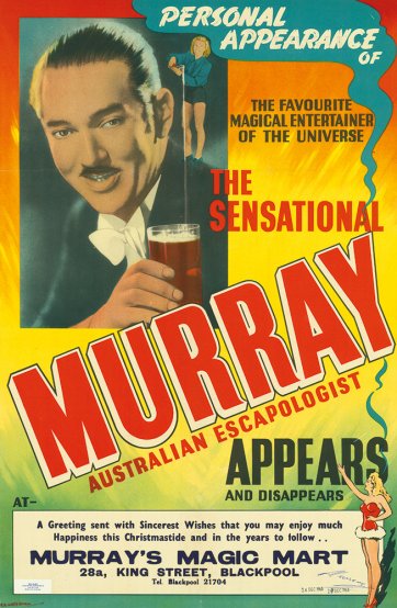 Murray was still a child conjurer when Rickards died in 1911, but when JC Williamson added the Tivoli Circuit to his theatrical empire in the 1920s he made a point of featuring the now famous escapologist in his shows. A March 1928 review in The Sydney Morning Herald described Murray’s baffling performance as having ‘all the magic of the Arabian Nights’. In 1947 he was back on the Tivoli Circuit, this time promising to jump handcuffed and in chains off the Sydney Harbour Bridge – a feat he never attempted. Murray’s career ground to an end in 1953 when he was diagnosed with an unspecified ‘nervous disorder’. He retired to Blackpool in England where he ran a magic shop, but never quite gave up the hope of returning to the stage. ‘I want to hear again the applause of the people in many strange lands,’ he reminisced to his biographer Val Andrews in the early 1970s. ‘I want to see again the wonders of the world. I want to feel that wonderful feeling of freedom attained by the freelance traveller who can always earn his keep.’