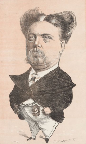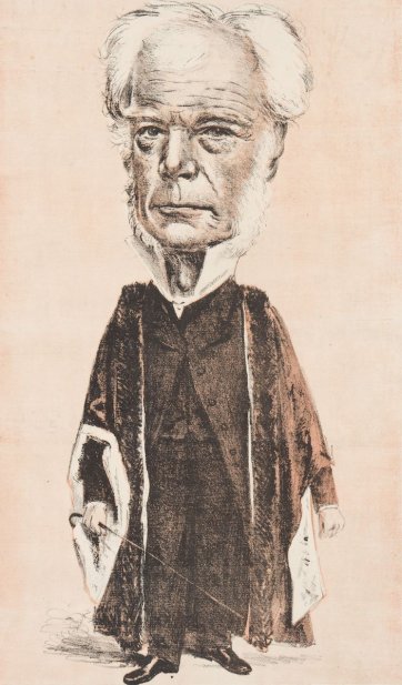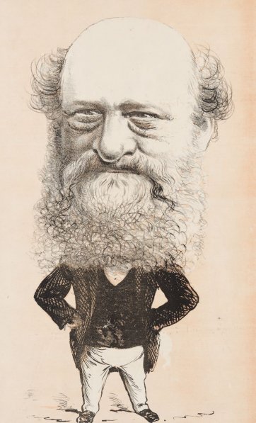 Actor and entrepreneur William Saurin Lyster (‘Opera’) is another instance of a subject spared disparaging treatment. Durkin drew him as spruce and dinner-suited, a depiction befitting someone to whom ‘the people of this colony are, more than to all others, indebted for good music, with which he has made it his business to supply them’. Others are caricatures in the stricter, dictionary-sense of the word, wherein a sitter’s peculiarities or character flaws are exaggerated. The incongruously nicknamed William McLennan, (‘Dove of Ararat’) for example – a parliamentarian, ex-miner, and firebrand advocate for workers’ rights – is shown as gruff, nuggetty, and seemingly spoiling for a stoush. The fabulously wealthy Goldsbrough, his waistcoat buttons straining, rests his well-fed frame against a wool bale, smoking a cigar; the corpulent politician Sir John O’Shanassy (‘Wroth with Kilmore’) dwarfs the armchair he’s seated in; while Beaney – ‘the lucky surgeon who pockets the most fees of any of the soothers of the ills of mortality’– is shown as richly attired and alarmingly quiffed.