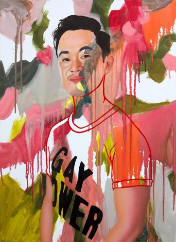 Leutwyler engages with ethical considerations throughout the art-making process, from the materials she uses (oil, despite her love of acrylics, which leaves virtually no waste as opposed to plastics entering the waterways) to the people she chooses to paint, those she admires and has been impacted by, raising the profile of queer people in a way that leads to open dialogue and action when she releases the finished portrait into the world. There is respect and care here, an engaged enquiry into the ethics of looking, an acknowledgment of and commitment to disrupting the objectifying gaze, which through the history of western visual culture has been an overwhelmingly male one; as Leutwyler notes, taking ‘pleasure in subverting traditional norms of portraiture to challenge heterosexual conventions of identity and sexuality’. A commitment also to seeing on the walls of major galleries portraits by a queer woman of queer women, gender diverse and trans people absent or erased from the historical narrative and still wildly underrepresented.