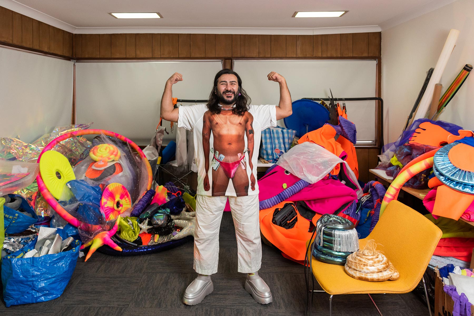 HOSSEI’s work is touchable, wearable, emotional, funny and so bombastically colourful it invites delight from intergenerational audiences. As HOSSEI reflects on the progression of his practice and the comic threads of his personal traumas and joys as a Persian artist in the LGBTQIA+ community, he reminds me of his work’s earnest intentions. ‘I’m so serious about being silly though, I hide real emotions in all that technicolour theatricality.’