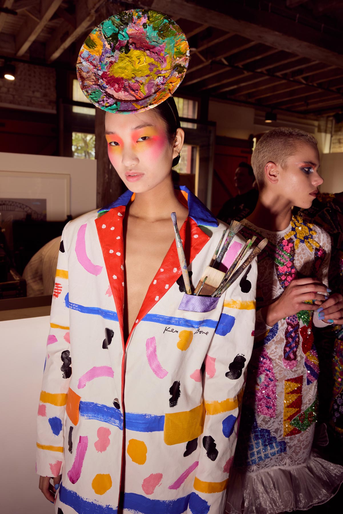 Ken Done likens their Resort 2023 collaboration to ‘three cooks making a giant banquet’, adding that he knew it would work as he was ‘already thrilled with their creativity’. He notes their intuitive design nature; when the pair first visited his studio, Plunkett’s eye was immediately drawn to one of the paint-splodged enamel plates that the artist uses as a palette. She thought that it would look great as a hat, picking it up and modelling it as one. A number of catwalk looks were finished off with the dishes, refashioned into headpieces.