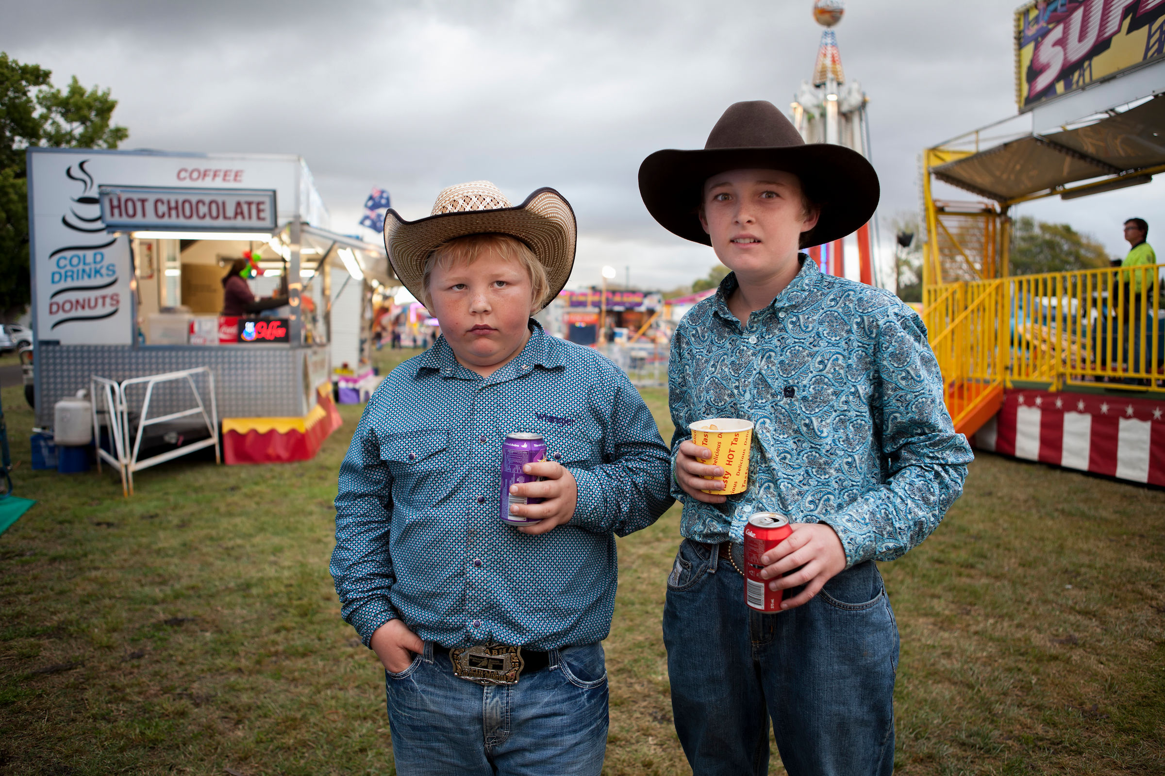 After completing a bull ride in the rodeo competition at the Singleton Show in New South Wales, cowboys Dusty Parker and Jed Martin visit sideshow alley for some hot chips and fizzy drinks. This portrait is part of a series documenting agricultural shows around Australia.