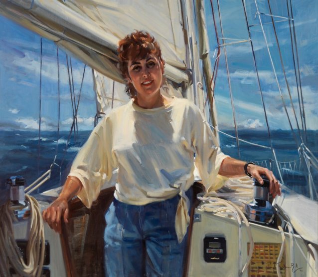 Kay stands in a relaxed pose against the entry to the yacht’s cabin, facing towards us. The main sail cloth is raised and shown behind her, cropped by the edge of the painting. Many lengths of taut rope are attached from the yacht up to the main sail in vertical lines with other lengths of rope coiled-up ready for use around her. The yacht is white with wooden accents and has small panels with buttons on the side facing us.