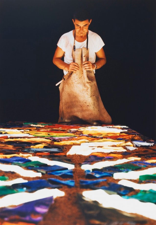 Leonard French OBE (1928-2017) left school at fourteen to become an apprentice signwriter in his native Melbourne. He later studied part-time at the Royal Melbourne Institute of Technology. After the war, he visited Europe, studying the Byzantine art whose influence would later become evident in his work. On his return to Australia, he taught at various Melbourne technical schools until the late 1950s. In 1956 he completed the seven-panel Legend of Sinbad the Sailor which hung in the ultra-modern Legend café in Melbourne. Henceforth, he became one of the country's most successful and sought-after artists (although he worked as the National Gallery of Victoria's Exhibitions Officer between 1956 and 1960). His enormous dalle de verre (concrete and slab glass) ceiling in the Great Hall of the National Gallery of Victoria was commissioned in 1963, and completed in 1968; other monumental glass projects of the sixties and seventies were the windows for the new National Library in Canberra, the Alpha and Omega window in Monash University's Blackwood Hall and the mural Regeneration in the Great Hall of University House, ANU.