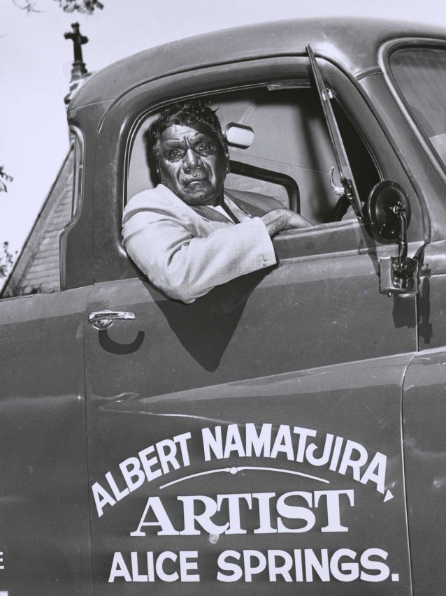 Albert Namatjira (1902-59) became interested in painting at the Hermannsburg Mission in the 1930s. After learning watercolour technique, he was persuaded to exhibit his work in Melbourne in 1938. The exhibition sold out in two days. During the 1940s his work became fashionable throughout Australia and he was the subject of a biography and a film. In 1954 he met the Queen in Canberra, and he was awarded citizenship status in 1957. One of the consequences of citizenship was that Namatjira was legally entitled to buy alcohol, but when he shared it with his fellow Arrernte, as custom required, he was sentenced to imprisonment. Although the sentence was commuted, he never recovered, and died the following year. Nearly 50 years after his death, Namatjira remains the best-known of Australian Aboriginal painters.