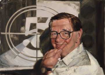 The scroll in this painting refers to an oceanic spiral eddy that Scully-Power discovered while in orbit on the Challenger. The Nereus badge, depicting the Old Man of the Sea, was designed by the Scripps Institution of Oceanography for him to wear on the expedition. His cufflinks commemorate his honour as a Freeman of the City of London.