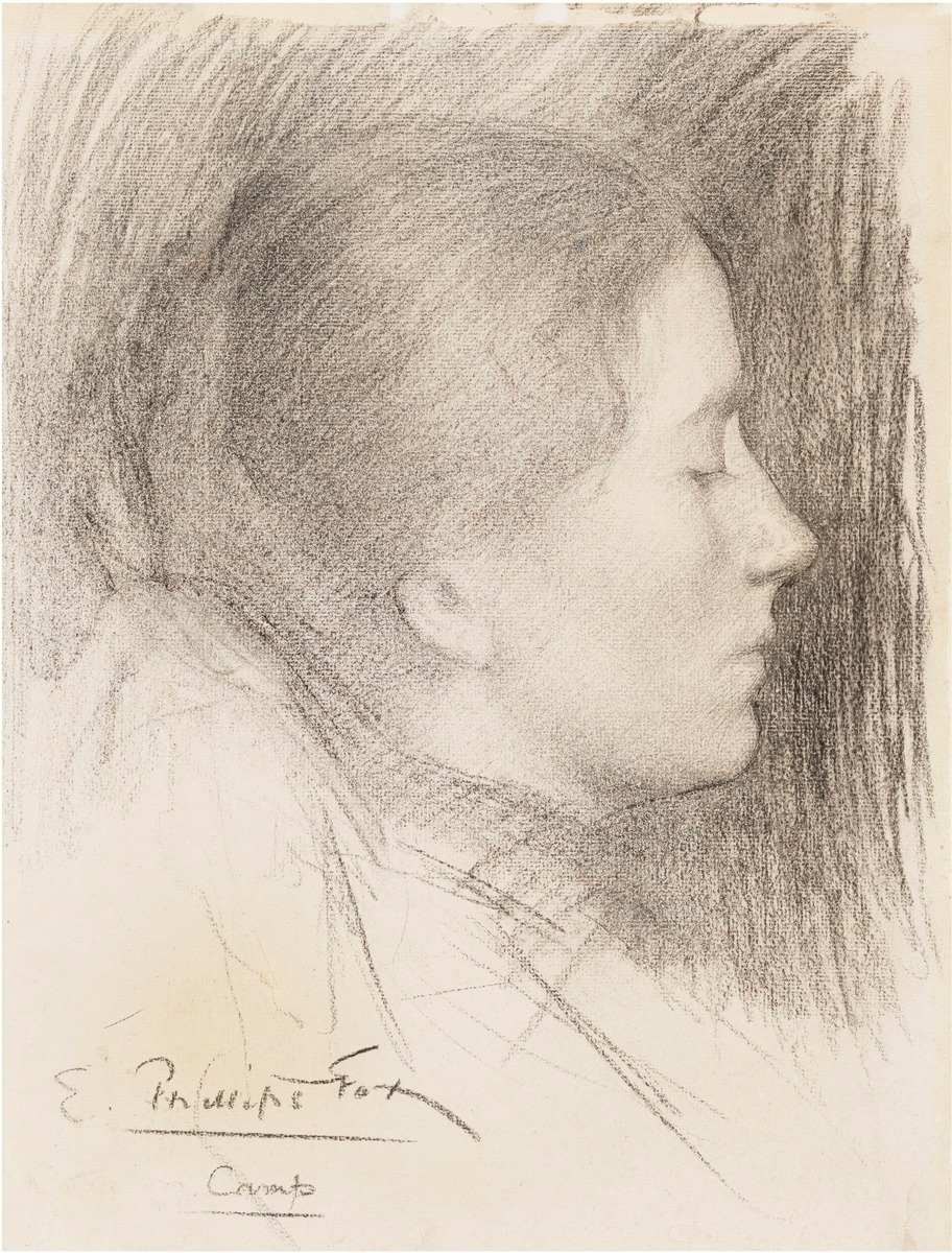 Artist Georgina Alice 'Ina' Gregory (1874–1964) was born in Melbourne, the daughter of barrister, scholar and amateur theologian, John Burslem Gregory and his wife, Alice. Against her mother's wishes, she studied at the National Gallery of Victoria School and attended classes run by Emanuel Phillips Fox at the Melbourne School of Art and at Charterisville, a property in Ivanhoe where Phillips Fox and Tudor St George Tucker ran summer schools in the 1890s. The word 'Camp' inscribed on this drawing of Gregory by Phillips Fox indicates that it was made there. Ina Gregory is one of five women depicted in Phillips Fox's painting Art Students (1895), which attracted criticism when it was first exhibited for showing the subjects in their 'unfeminine' paint-splattered smocks and aprons. A portraitist who came to specialise in landscapes and garden views, Gregory exhibited from 1898 to 1912 with the Victorian Artists' Society and in the 1907 Exhibition of Women's Work.