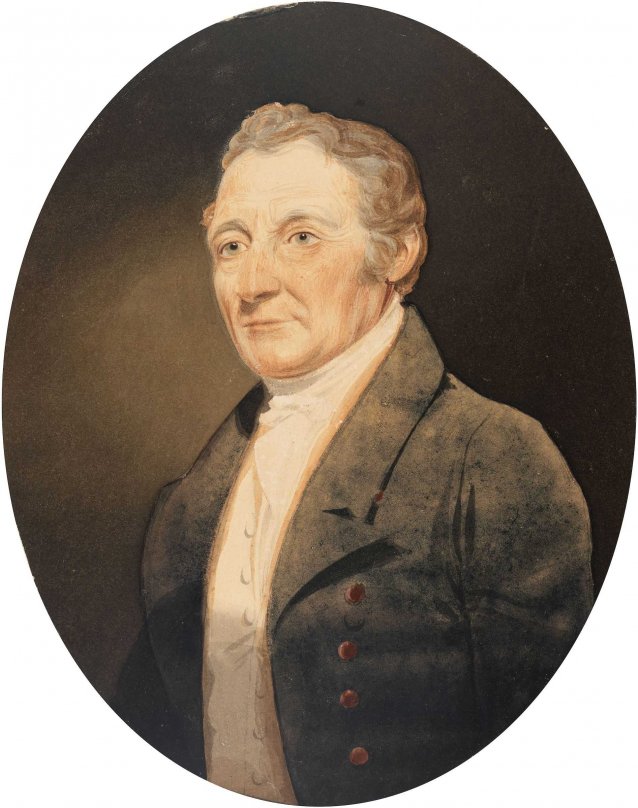 John Connell (c. 1759–1849), free settler, merchant and landowner, arrived in Sydney in June 1801. Soon afterwards he started a hardware store on Pitt Street, and later acquired a substantial estate on the Kurnell Peninsula. In addition to his various business interests, Connell served as a coroner and juror and supported charitable and community causes. Though it’s not known for certain, it's probable that Connell's portrait is the work of Richard Read junior, who arrived in Sydney in late 1819. By March 1821 had established himself as a 'Miniature, Portrait and Historical Painter' in Pitt Street, styling himself 'Read junior' so as not to be tainted by association with the other Richard Read in Sydney: his father, who’d been transported to the colony for forgery in 1813. Read junior produced portraits in watercolour on ivory and on paper, with the majority of his commissions coming from military officers and business people who liked his direct, unpretentious style.