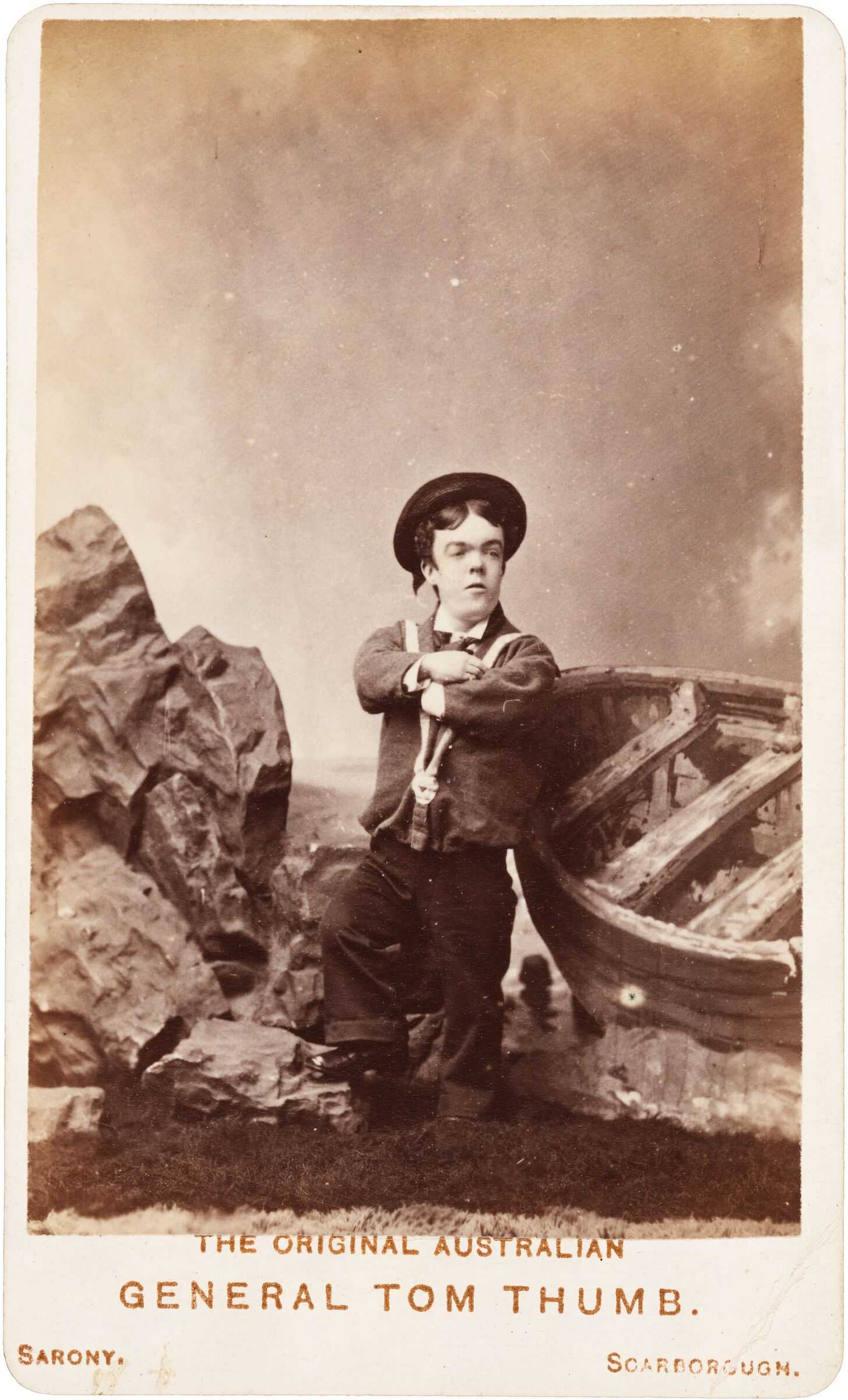 John David Armstrong (1857–1943) was a sideshow and vaudeville performer known as ‘The Australian Tom Thumb’. Born in inner-suburban Melbourne, he made his stage debut at the ‘Prahran Popular Entertainments’, aged fourteen, in August 1870, the same month in which the ‘Original General Tom Thumb’ – the American Charles Sherwood Stratton (1838–1883), who achieved international fame as a member of PT Barnum’s touring sideshow troupe – was also appearing in Melbourne. With his ‘Lilliputian dimensions’ of 34 inches high and billed as ‘one of the greatest wonders of the age’, Armstrong immediately became the subject of carte de visite photographs, which were sold to patrons attending his performances. In 1871, he was exhibited alongside Chang the Chinese Giant and Chang’s wife, Kin Foo, in Melbourne, Bendigo, Geelong and other towns; and in 1879, having made numerous other appearances, he embarked on an overseas tour that encompassed the UK, South Africa and the USA. Following his return to Australia, Armstrong went back to the local circuit, appearing on the program at George Selth Coppin’s theatre in Melbourne and on those of various other venues and events. Typically florid contemporary reviews of Armstrong’s performances describe his being ‘received with yells of delight’ and his causing ‘a diversion of wonderment on all sides’ with his comic songs. He retired from the stage around 1910. He claimed he was the world’s shortest Freemason, and later in life often related the story of the encounter with Queen Victoria that occurred when, driving through Windsor, his tiny goat-drawn carriage frightened the horses harnessed to Her Majesty’s coach. Rather than being affronted, the Queen ‘greeted Armstrong with a smile and sent her coachman across with a message for him to pass on’. Armstrong never married. He died in Melbourne at the age of 86 in August 1943.