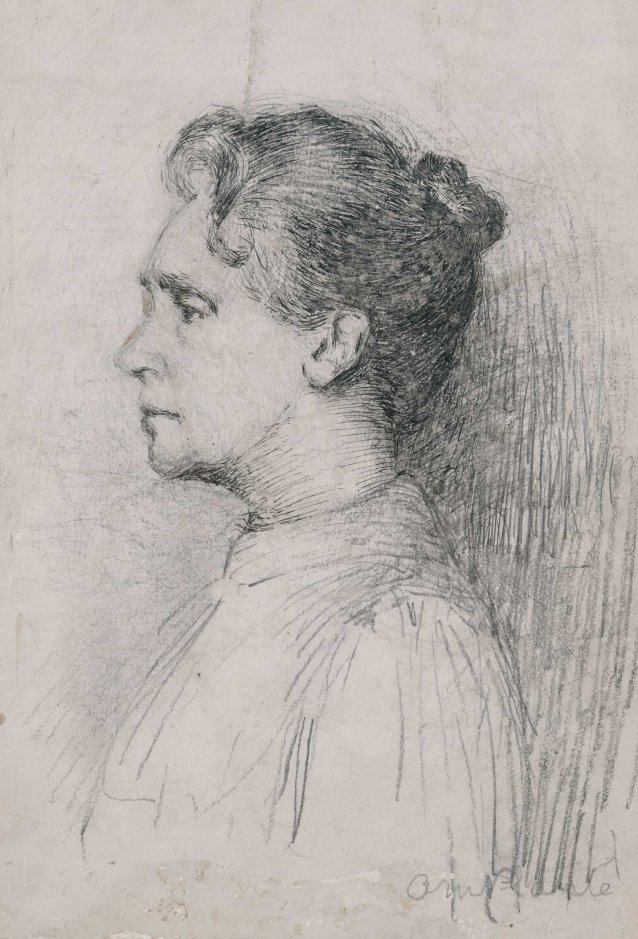 Captured quickly in pen, ink and pencil, Plante has drawn herself in profile, her hair drawn back and eyes downcast, perhaps a reference to her self-described shyness.