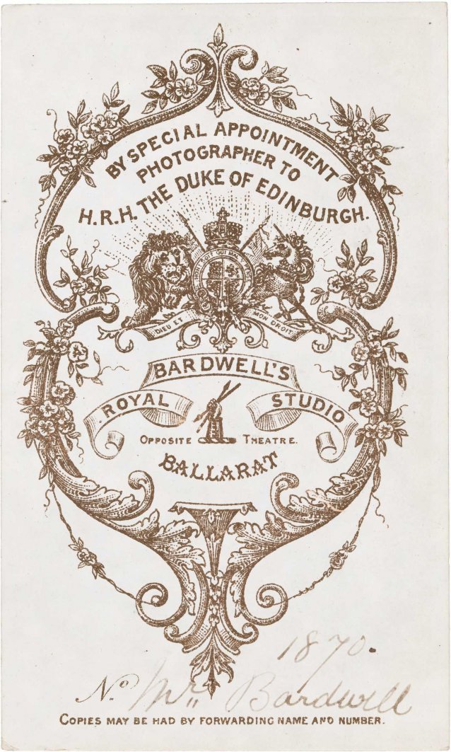 Photographer William H. Bardwell worked in Ballarat, Victoria from 1858 until 1878, and for much of that period he operated his own business: the Royal Photographic Studio. 'The studio is every way replete with suitable accommodation … and rooms are provided for both ladies and gentlemen,' stated one advertisement. 'Mr Bardwell's long and practical example will entitle him to the claim to the first position in Ballarat as a photographer,' it continued. Bardwell took advantage of his studio's close proximity to the Theatre Royal, producing photographs for visiting theatre groups and operatic companies. He exhibited photographs of Ballarat at the Intercolonial Exhibition in Sydney in 1870 and had a photographic panorama of Ballarat in the Victorian section of the London International Exhibition of 1873. From 1878 he worked in Melbourne, though the Ballarat studio continued to operate throughout the 1880s.